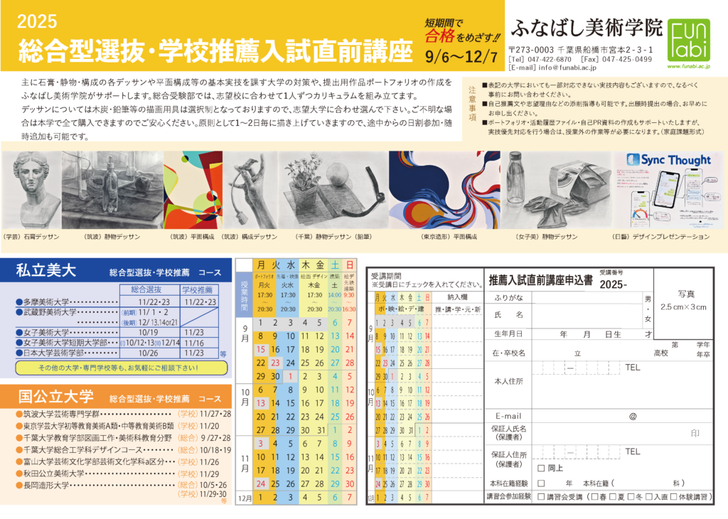 筑波大学芸術専門学群・千葉大学教育学部・東京学芸大学教育学部・長岡造形大学・秋田公立美術大学等の国公立大学をはじめ、東京造形大学・女子美術大学・日本大学芸術学部等の私立美術大学総合型選抜及び学校推薦試験に対応しています。